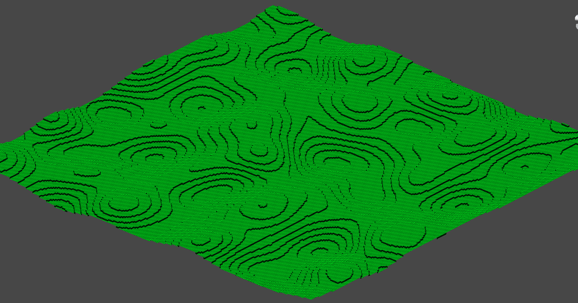 These values were mapped by modifying the vertex colors on the meshes generated, by first generating a RGB value that corresponds to the values of these 3 variables at the point of the block in question.